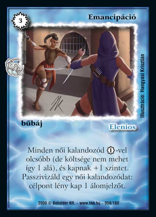 A HKK történetében talán soha nem volt olyan kiegészítő, ami ne tartalmazott volna valami új koncepciót. Ez alól a Kasszandra álma sem lesz kivétel. Egy nagy kedvenc, a bajszos-szakállas kalandozó pakli kap riválist – a retró érzéshez remekül passzolva – nem mást, mint a női kalandozók álmot hozó seregét. A Pozitív diszkriminációt bár sokan szeretik és próbálgatták, nem igazán ad eleget, hogy életképessé tegye a koncepciót. A tesztelés során viszont azt tapasztaltuk, hogy a női kalandozók alapból is gyengébbek szakállas társaiknál. Ezért az Emancipáció erősebb alaplap, mint a Pozitív diszkrimináció. A már-már kötelező szintlépés mellett olcsóbbít egyet, és álomjelzőkkel is hátra tudod küldeni a hölgyeket az őrposztba udvariatlanul nem előre engedő szakállasokat. Mint mondtam, a már meglévő női kalandozók azért nem voltak túl acélos lapok, még az erős alaplapjuk mellett sem garantált, hogy a versenyasztalok megkerülhetetlen csapata lesz, de a célt hozza: jól játszható koncepciót, és nem csupán mókapaklit lehet belőlük építeni. A kiegészítőben minden színből érkezik újabb női kalandozó, így nagyon sokféleképp lehet majd a csajokkal kísérletezni.