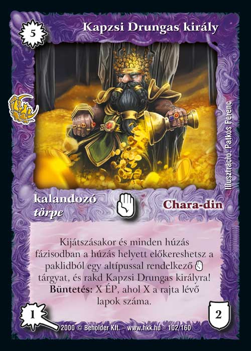 Az ilyen speciális mechanikájú lapok mindig garantáltan megmozgatják a játékosok fantáziáját. A mi Kapzsi kis haverunk azonban nem csak a fantázia játéka, hanem a versenyasztalok nagyágyúja lesz. Mert nagyon erős az, amit csinál. Konkrétan mindig a szituációt megoldó lapot választhatod ki vele a pakliból húzás helyett, amit ráadásul ingyen játékba is tehetsz. Azért ezt a remekül hangzó mókát némileg beárnyékolja, hogy csak altípussal rendelkező KF-tárgyat szedhetsz vele elő, és ugye minden altípusból csak egyet birtokolhat. Ennek ellenére is megdöbbentően széles lesz az a lapkészlet, ami rendelkezésre fog állni, hogy egy Kapzsi királyos paklival kísérletezgess.