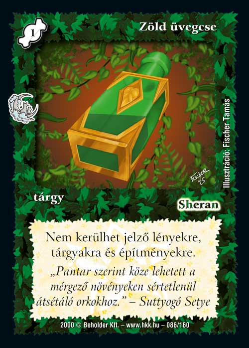 Végül egy igazán egzotikus tárgyat prezentálnék, a Zöld üvegcsét. A lapok átlag költségétől eltekintve a retró másik igazi íze, hogy mindig akad 1-2 lap, ami ránézésre végtelen kérdést tud generálni. Ebben a kiegészítőben tippre 2 ilyen nemgyakori lesz és a Zöld üvegcse az egyik.A szimpla szöveg mögött megbújik pár dolog azért, amit nem árt már most tisztázni:1, A késleltetett és Időleges hatás jelzőket a lapok Zöld üvegcse mellett is megkapják kijátszásukkor - ez a Kódexben egyértelműen le lett írva.2, A már lapokon levő jelzők nem fognak leesni, ha kijátszunk egy Zöld üvegcsét, de pl. méreg jelzők nem szaporodnak tovább.3, Ha egy forrásnak a költsége, hogy valamire tenni kell egy jelzőt (pl. Trikornis herceg), akkor azt nem fogod tudni használni - hiszen nem tudod kifizetni.És még az Elemi védelemmel sem kombózik. Akkor mire lesz jó ez a lap? Egyrészt rengeteg dologtól védheti a lényeinket. Álom, méreg, gyengülés, tinta, etc. Leállíthatjuk az ellenfél Mágikus pulzánsát vagy éppen megállítjuk a miénket mondjuk 5 jelzőnél. Örökre. Másrészt akadnak vele kisebb-nagyobb kombó opciók lényekkel is. Ősdentor, Alvó szörny, Halálóriás, Kvazárbehemót...Valószínűleg lesznek tőle néha rémálmaim bíróként, de elég érdekes lapnak tűnik, hogy megérje.