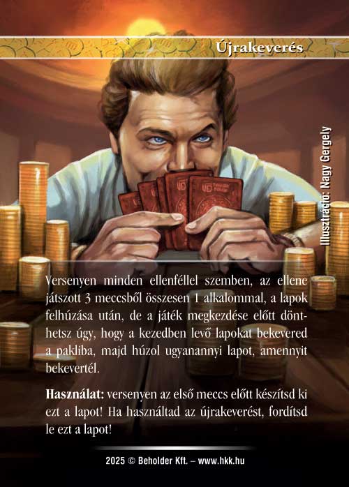A HKK segéddel kapcsolatban több olyan visszajelzést kaptunk, hogy túl egyszerűnek találtátok a fehér kartonlapokat az Idézéssel és Újrakeveréssel. Ezért 2025 elején jönni fog a HKK Segédek tuningolt verziója, amelyben eredeti HKK hátuljú, Cartamundis gyártású lapokon lesz ez a 2 funkció, méghozzá gyönyörű full artos grafikával (csomagonként 50% eséllyel, hogy az egyik lap foil lesz). A HKK segéd ára a 2 extra lap ellenére változatlan marad!