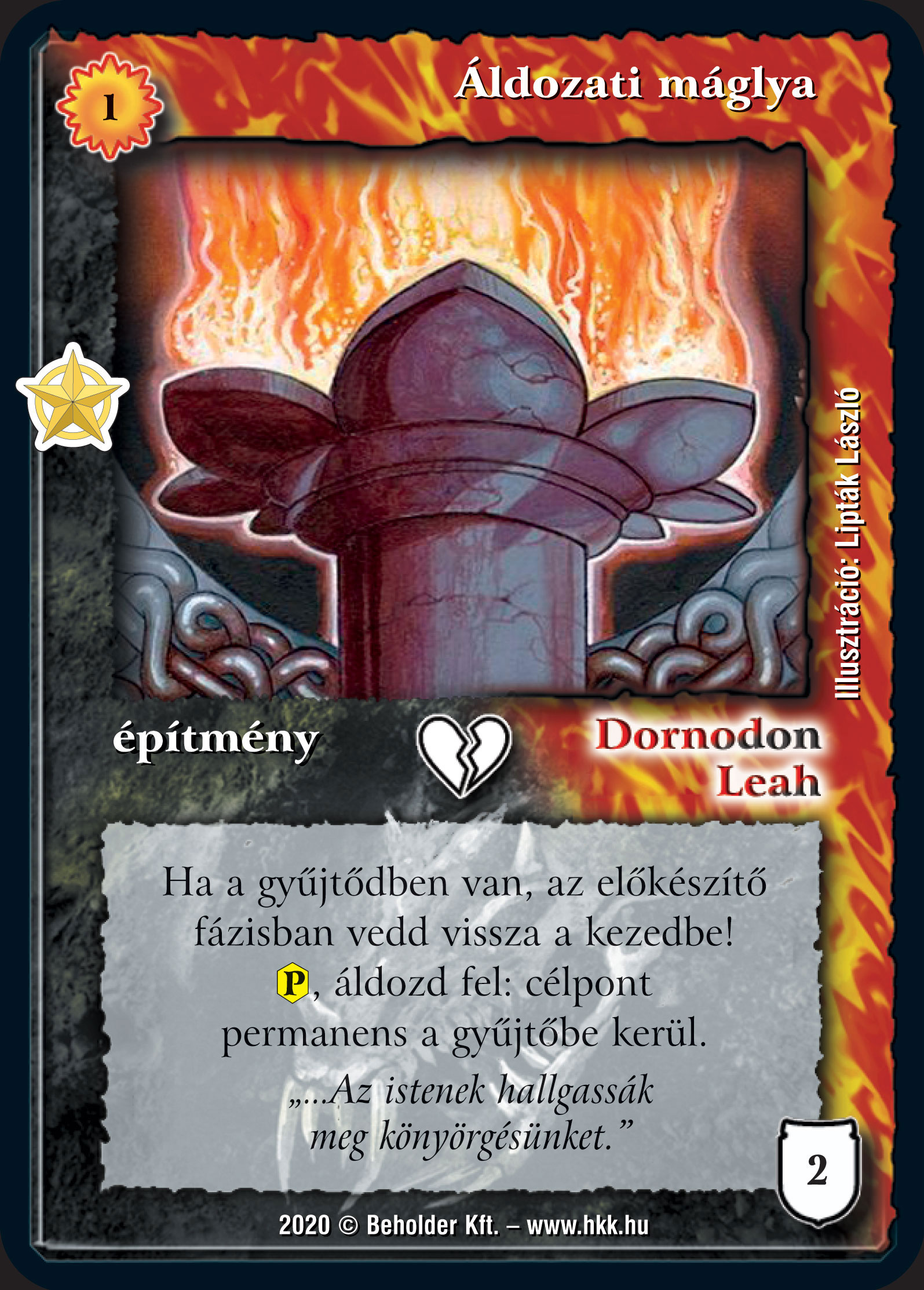 . Egy passzívan érkező, kétszínű épület, nyilván nem egy versenylap, de talán érdekesnek találjátok, hisz a HKK-ban rég volt már kétszínű lap. Ezt a lapot fogjuk kiküldeni azoknak, akik BDV-n keresztül alfa paklit rendelnek tőlünk: minden 6 megrendelt alfa pakli mellé egy ilyen lapot, a készlet erejéig. Bónusz: minden Áldozati máglya helyett 1:6 eséllyel szintén Cartamundi-s