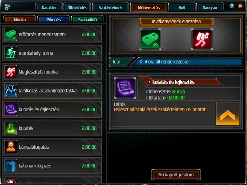 Az időbeosztásnál kiválaszthatod, hogy mit csináljon a karaktered a 8 óra munka, pihenés és szórakozás alatt. Ez mindig egy adott napra vonatkozik, de ha nem akarsz rajta másnap változtatni, elég egy gombnyomás a „Véglegesítés”-re, és nem kell előről végignyomkodni az egészet.