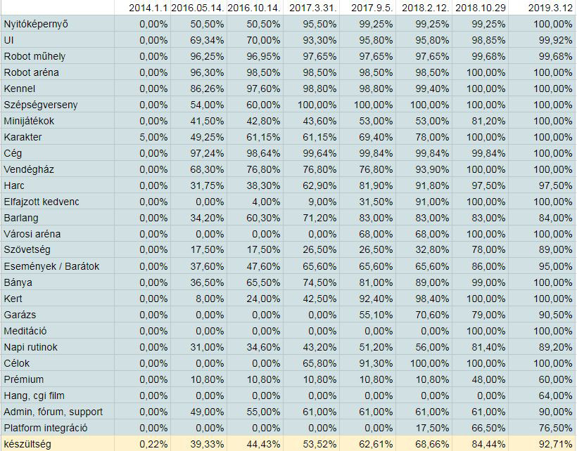 játéknak csak a tervezése egy teljes évbe került. Minden modulhoz részletes dokumentációt írtunk, és hatalmas excel táblázatokban meg lettek tervezve a képletek, a fejlődési ütem, sok-sok szinttel előre a megszerezhető robotok, tárgyak, növények, autók stb.