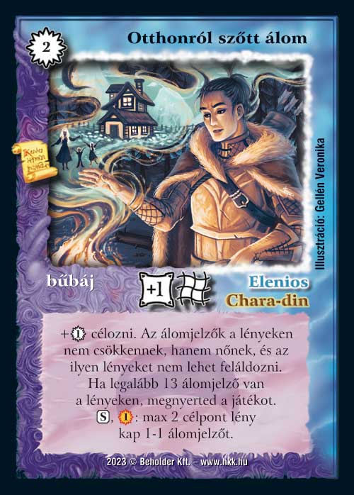 És akkor utolsóként az egyik új ultra (ami szintén a kedvencem a szettből - igen igazából magamnak írom ezeket a sorokat csak, aztán felmarkolom a milliónyi kreditet érte), ami szintén kétszínű lesz, az Otthonról szőtt álom Chara-din és Elenios szerelemgyereke. Igazából egy új ultra ritka bűbájként is tekinthetünk rá, hiszen ultra ritka és bűbáj ugyebár. Igaz nincsen olyan komoly védelme, mint a klasszikus UR bűbájoknak, de azért drágább rá reagálni és leszedni is picit nehezebb. A képessége szerintem nagyon jópofa, egy kis interakció az álomjelzőkkel és bele van építve egy nyerési opció is. Igaz nem az a lap lesz, amit beteszel mindenbe, amibe a színe engedi, sokkal inkább köré kell építeni majd, de mókás dolgok születnek belőle. Tokozó rakshallionon el lehet gondolkodni mellé.
