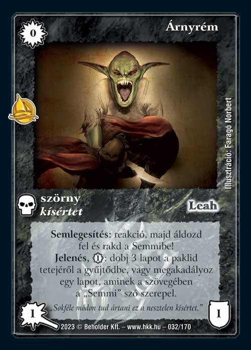 Rögtön hétfőn kezdjük is egy ingyenes semlegesítéssel, úgyhogy akiknek elege van a reakciókból, azok most forduljanak el! Mondjuk a legújabb Árnyrém inkább egy védekező típusú semlegesítés, hiszen csupán reakciókat tud megakadályozni, így megvédve a saját lapunkat az ellenfél ármánykodásától. Jó igen, tudom, hogy akár a saját ármánykodásunkat is megvédhetjük, de ettől még alapvetően ez egy védő reakció. A második képessége már kissé speciálisabb, hiszen egyrészt csak akkor tudjuk használni, ha nem sikerült vele semlegesíteni (mondjuk ez szerintem rendben van így), másrészt egy speciálisabb pakliban fog igazán jól működni. Persze elég sok lap tud ma már Semmizni, így elcsíphet akár jelenésre is egy lapot, de a generálás részét egyértelműen a gyűjtőgenerálós paklik fogják tudni használni.