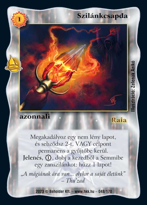 Haladjunk is tovább a reakció vonalon, viszont ezúttal egy varázslat alapút veszünk kicsit górcső alá. A Szilánkcsapda anno a Zanszilánkokban jelent meg először, de sosem futott be igazán nagy karriert, talán a mostani verziónak kicsit több sikere lesz. Egy zanszilánkért nem lény lapot tud fogni, de akkor sem kell kétségbe esni, ha az ellenfél lényt játszik ki, hiszen alternatívaként leszedni is tud. Talán egy védekezés ikon hiányzik még róla, de így is szépen beilleszkedik szerintem az új generációs megoldások közé, hiszen cél lenne a kicsit kevesebb semlegesítés és több varázslat alapú beleszólás a játékban. Védekezést ugyan nem, de egy jelenést azért kapott, igaz viszonylag marginálisat, hiszen ritka lesz az, hogy dobni tudunk neki. Pontosabban az nem lesz ritka, hogy lesz zanszilánkunk, csak nem feltétlen akarjuk majd eldobni. Nyilván előfordulhat, hogy blankot húztunk és inkább lecseréljük, de nem lesz túl gyakori eset.
