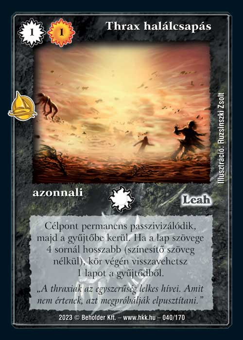 Két reakció után a hét közepén lessük meg egy legendás leszedés felújítását, a Thrax halálcsapást! Elődjeihez hasonlóan ő is ősmágiás és természetesen, ahogy korábbi verziói, úgy ez is jobban működik, ha hosszabb szövegezésű lap van megcélozva vele. Ez nem is olyan nehéz a játék jelenlegi bonyolultsága mellett, hiszen egész sok lap van, aminek szövege hosszabb, mint 4 sor. És amíg a legelső verziója csak hosszabb szövegű lapot szedett le, az előző meg csupán némi sebzést adott extrába, addig ezzel a verzióval visszavenni tudunk egy lapot a gyűjtőből, ami egy elég erős lappá teszi szerintem. A Hódításokban persze rengeteg hajó fog megjelenni, amiket ugye nem egyszerű leszedni, viszont pont emiatt a halálcsapás első lépésként passziválja a célpontját, így hajókat is elég optimálisan viszi a Thrax.