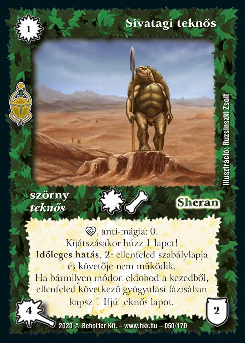 Az első ilyen, nevében és illusztrációjában is hangulatot idéző lap, a Sivatagi teknős. Igen, a kis vízi páncélosok még ilyen zord körülmények között is megvetik a lábukat! Nézzük, mit is tud ez a felújított lap. Egy manáért, ősmágiával, cantripként túl rossz már nem lehet. Végre egy megszüntetés/visszakapcsolás, ami nem rak laphátrányba minket, ez a legerősebb ilyen jellegű kártya a játékban. Tökéletes side lap lesz belőle drágítós koncepciók, sok követős felállások és akár Semleges csatamező ellen is. E mellé viszi tovább a 11. kiadás sztárjának, A teknősök bölcsességének vonalát is és kitűnően fog muzsikálni Korlátozás mellé, ahol eldobva még egy extra lapelőnyt is kinyerhetünk belőle.