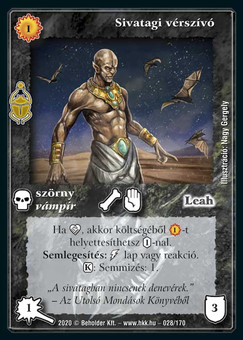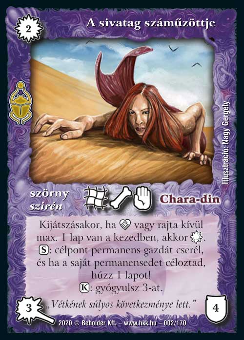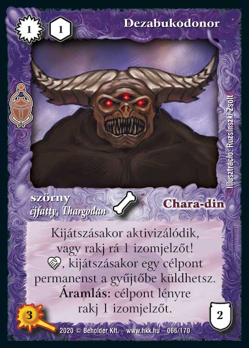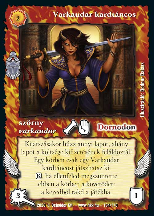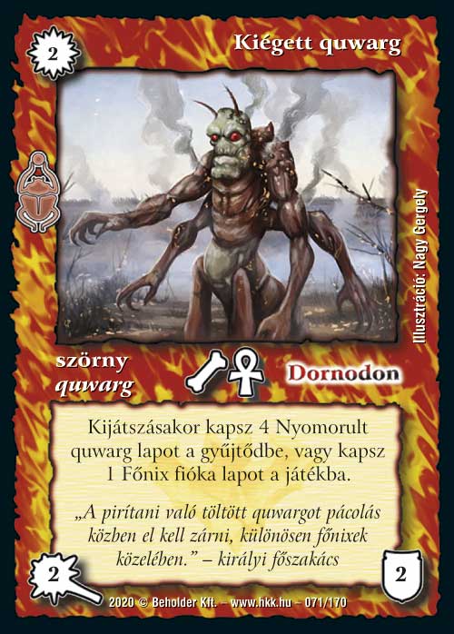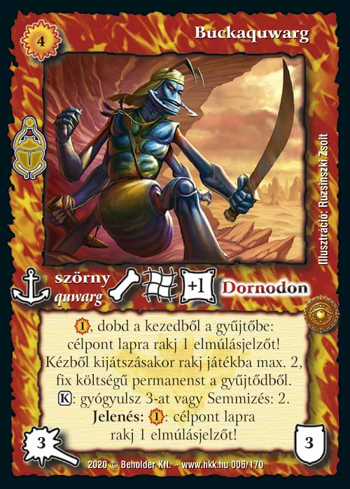 Az isteni lapok igen erősre sikeredtek a Homokdűnékben, így Dornodon sem panaszkodhat. Már maga a kézből eldobós képessége is igen erős, nagyon nehezen reagálható módon szed le egy lapot. És ugye a kis bucka srác ugyanúgy ki tud osztani egy elmúlásjelzőt jelenésre is, ami azt jelenti, hogy a kijátszása nélkül 2 darab lapot is megtud egyből oldani, mivel az első képességének a szokásoktól eltérően nem a Semmibe, hanem a gyűjtőnkbe kell hajítani a rovar fiút. És persze van egy több mint korrekt kijátszáskori képessége is, amivel két lapot visszapattint számunkra a játékba. Ez a képessége mindegyik paklijában igen esszenciális elemmé varázsolja majd: quwargoknál erősen segíti a pasziánsz faktort, de járjakban és egyéb korlátozó szabálylapok mellé is nagyon erős ez a funkció. És természetesen zanszilánkos költsége van, így aminek az áldozásából kijátsszuk, máris jöhet vissza terrorkodni.