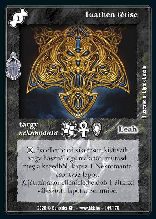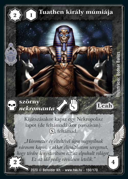 Végre elértünk magához Tuathen királyhoz is. Vegyes költségű lényként adja magát egy drágító koncepcióhoz, de a feltámadása miatt más korlátozó szabálylapokhoz is tökéletesen illeszkedni fog. Természetesen jó uralkodó, így az érkezését minden alkalommal egy-egy Nekropolisz felhúzásával kell ünnepelni, így téve szert további seregre, illetve lapelőnyre.