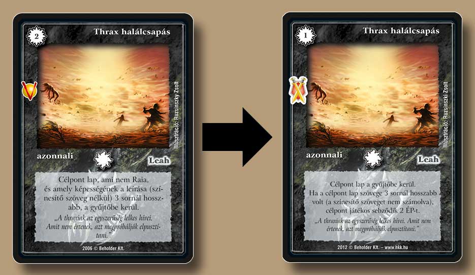Erre jó példa a Thrax halálcsapás: amikor a Legendák völgyében megjelent ez a lap, évekig csúcskategóriás spoiler volt, mert kettőért azonnaliként ősmágiával majdnem mindent leszed, ez abban a környezetben brutálisan erős volt. A felújítására 2012-ben került sor, megint a kornak megfelelő paraméterekkel: immáron egyért jött, maradt az ősmágiája, bármit le tudott szedni és még egy minimális előnye is volt. Mégsem tudta elérni az elődjének a népszerűségét, sőt, igazából a versenypaklikban használhatóság határán mozgott. És nem azért, mert a leszedések között gyenge volt, hanem, mert már ekkor felmerült az a dilemma, hogy a leszedés önmagában elegendő képesség-e egy lapra?