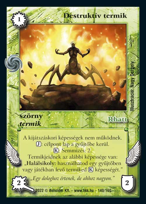 Nyilván a pakliba bekerült az amúgy ultraritka A hét kulcs őrzője is, de helyette nyugodtan be lehet rakni bármilyen kánterelést, abban úgyis kicsit szűkölködik a pakli, de adja magát akár a Termik evolúció is helyettesítőnek. Ugyan csak egy szűkebb szegmenst kánterel, de bármely termikünket elő tudja venni. Csak azért nem raktam be alapban, mert már nem volt mit kihagyni a pakliból, hogy helyet csináljak neki, és az 5 lapos kezdés miatt az első körökben van választékunk, mit játsszunk ki, inkább a mana, aminek szűkében vagyunk. A Redukáló termiket én nem raktam be, így is 30+ járj kompatibilis lap van a pakliban, és más drágítás ellen is akad jópár ősmágia, ő bőven elfér a kiegészítő pakliban. A bemutatónál sokak által erősnek ítélt Blobbakishból nekem 2 bőven elég volt. A dobásra kánterelés iszonyú speciális, még csak nem is fogja meg az összes lehetséges reakciót, a húzó forrás meg sok esetben csak egy képessége egy lapnak, jobb inkább a komplett lapot megoldani. Kivégzésnek nem rossz, de ahhoz azért meg kell érnünk pár kört. A termik spórával viszont, hiába vízió, 3-mal játszom, az a pár zsz a játék elején nagyon fontos, és ha behúzunk 2-t, még mindig el lehet húzni. Szegény Termiknátorból pedig lehet még a 2 is sok, az, hogy az ellenfél körében VP-ből használható a képessége, borzasztóan drágává teszi.