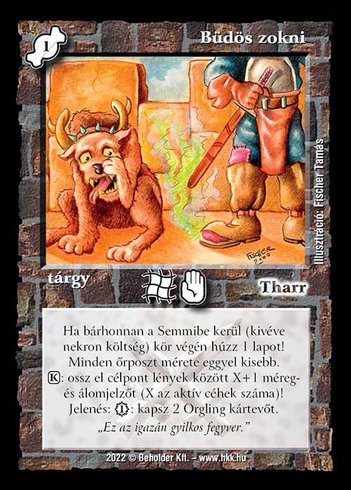 Mindegy, mennyi kompenzáció, reakciódrágítás van, és mennyire vagyunk agresszívak, annyi kántert kell csak bepréselni, amennyit lehet, még egy ilyen pakliba is :) Óriásból 12-t raktunk be, ez még édeskevés. A Gyilkos fegyver adja magát, univerzális leszedés, kánter, de kell hozzá a pakliban pár KF tárgy. Az Ongóliant diszkosszal kiválóan kombózik, hiszen amikor kisemmizzük a Gyilkos fegyvernek, még húzunk is rá. Illetve a Bűbájos moletta által generált diszkoszt is tudjuk majd neki semmizni. Még egy tárgyat érdemes berakni, ha már amúgy is játszunk Dornodonnal, legyen ez a Varkaudar lapát, semmizni mindig hasznos, főleg, ha mellette leszed vagy segít bevinni a halálos ütést. Sajnos a Roxat céheibe végül nem került be a Büdös zokni felújítása, a diszkoszhoz hasonlóan a Semmibe kerüléskor húz lapot. Pedig nagyon jó kombó volt a Gyilkos fegyverrel és a Művészek céhével is.