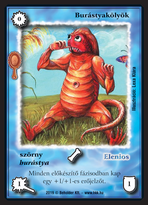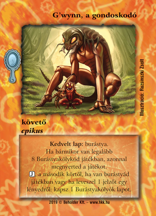 Aki figyelmesen olvasta a múlt heti előzetest, annak feltűnhetett, hogy a burástyák kapcsán emlegettünk egy követőt is. Nos, eljött az idő, hogy lerántsuk erről is a leplet. Szó esett arról is, hogy Elenios ezen visszatérő faját úgy terveztük meg, hogy többféle módon is össze lehessen állítani a paklit, éppen ezért az epikus követő kitalálásakor sem az volt a cél, hogy ez biztosítsa számukra a tempót vagy az erőforrást, hiszen ekkor egyértelmű lenne, hogy ezt kell használni, melléjük, sokkal inkább egy alternatív győzelmi feltételről van szó. A G’wynn, a gondoskodó ilyen téren hasonlít A hét törzs főnökéhez, kellő kiterüléssel nyerhetjük meg a játékot. A burástyák nagy része természetesen szépen termeli a Burástyakölyköket, így a cél közel sem lesz teljesíthetetlen. A tokenek ugyanakkor más narancs lapok (főleg Hegymélyi keltetővel és Zarknod bilincsével teszteltük őket) mellett sem lesznek haszontalanok, hiszen amint az látható, folyamatosan híznak a csöppségek, egyre nagyobb fenyegetést tartogatva – ráadásul alternatív felhasználási módjuk is lesz egy-két laphoz.